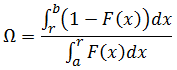 F(x) is the cumulative probability distribution (i.e. the probability that a return will be less than x), r is a threshold value selected by the investor and a,b are the investment intervals. It is effectively equal to the probability weighted gains divided by the probability weighted losses after a threshold.