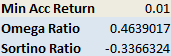 The Omega Ratio is easily calculated in Excel with a matrix formula. If cells A1:A15 contain the investment returns, and B1 contains the threshold return, then the Omega Ratio is