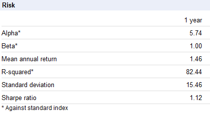 The Sharpe Ratio measures how effectively a fund uses risk (as measured by the Standard Deviation) to generate return. It’s the ratio of the effective return (the historical return minus the return you would typically get in a bank) divided by the Standard Deviation. Given that interest rates are typically 0.5% and the one-year return for the BMO Resource Fund is 17.77%, the Sharpe Ratio is simply (17.77 = 0.5)/15.46 = 1.12. That’s the figure given by Google Finance. A value greater than one is considered good, while a value greater than two is considered excellent.